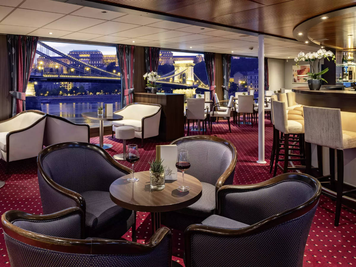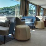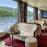 Bordausstattung: Großzügiges, gepflegtes Sonnendeck mit Schattenplätzen, modernen Outdoor-Möbeln, Liegestühlen, Minipool zur Abkühlung, Sonnensegel und Schachspiel. Geräumiger, modern-eleganter Panoramasalon mit Bugterrasse, Hecklounge, schickes Restaurant, Empfang mit Rezeption, Fitnessraum auf dem Hauptdeck, Reiseleiter-Desk, Aufzug zu allen Decks (außer Sonnendeck).
