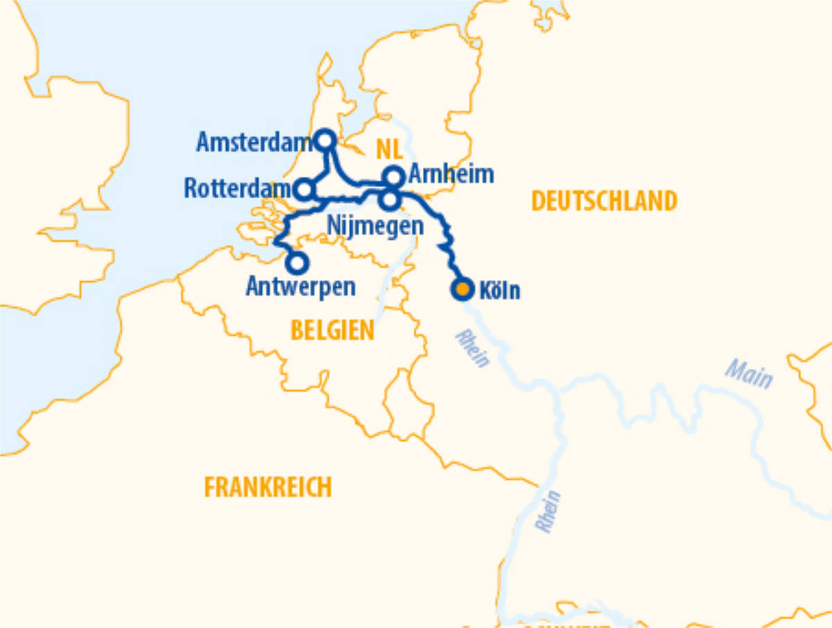 Am Neujahrstag erreichen Sie Amsterdam, wo Sie bei einer Grachtenfahrt das historische Stadtbild aus einer einzigartigen Perspektive entdecken. Unser letzter Ausflug führt Sie ins beschauliche Arnheim, bevor Sie nach Köln zurückkehren.