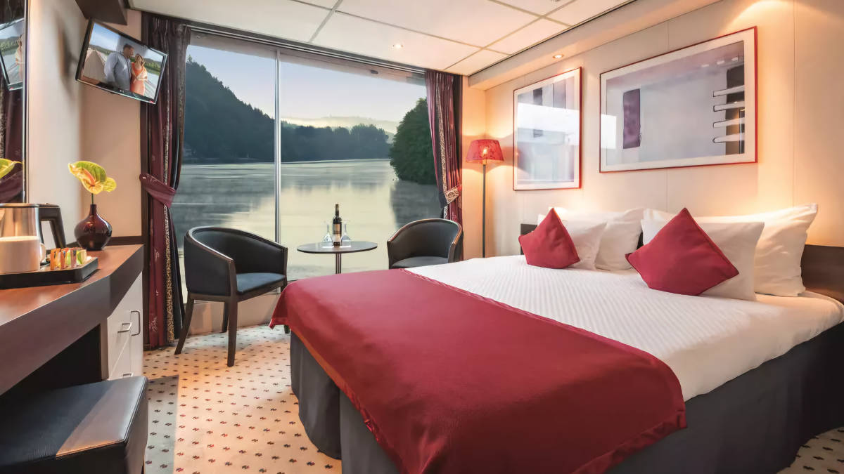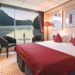 Ihre Kabine: Alle Kabinen sind Außenkabinen und auf dem Mittel- und Oberdeck (ca. 15 m2) mit bodentiefen Panoramafenstern zum Öffnen (frz. Balkonen) ausgestattet. Die Suiten (22 m²) auf dem Oberdeck mit französischem Balkon (raumhohe Panorama-Glasschiebetür) und Minibar. Die kleineren Fenster der Hauptdeckkabinen (ca. 15 m2 ) können nicht geöffnet werden. Alle Kabinen sind modern und geschmackvoll mit hochwertiger Ausstattung eingerichtet: DU/WC in Kabine. Badewanne/WC in Suite, dazu Bademantel in den Suiten, Föhn, wahlweise Doppelbett oder zwei Einzelbetten, Sat.-TV, Telefon, Klimaanlage/Heizung, Safe, Geräumiger Kleiderschrank, 2 kleine Sessel mit Tischchen, auf dem Hauptdeck eine Schreibecke mit kleinem Sessel. Oberdeck-Kabinen erhalten zur Begrüßung einen Obstteller und eine Flasche Sekt. In begrenzter Anzahl können zusätzliche 2-Bett-Kabinen zur Einzelbelegung gebucht werden; Zuschlag +70 %.