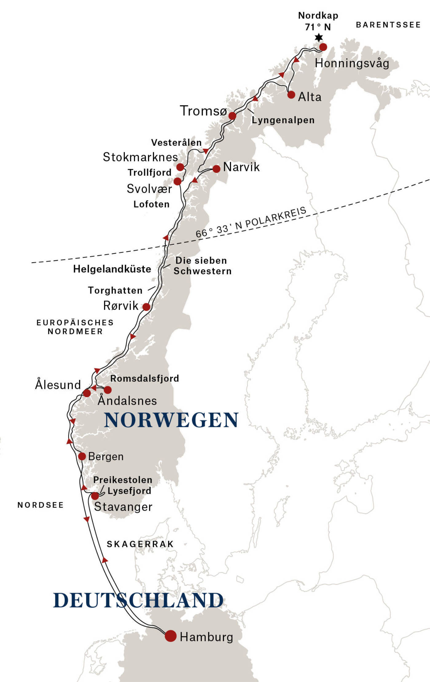 Am Morgen erreicht das Schiff den Hafen von Hamburg. Nach der Ausschiffung werden Sie von einem komfortablen Reisebus abgeholt und treten die Rückfahrt an. Die Ankunft an den jeweiligen Zustiegsorten erfolgt am Nachmittag, womit Ihre Reise entlang der norwegischen Küste endet.